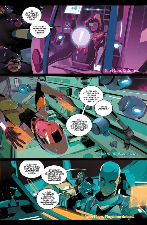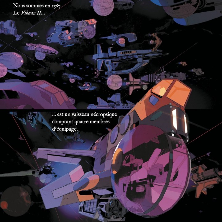 « 2367, aux confins de la galaxie. Dans ce futur lointain, l’humanité a épuisé toutes ses ressources et doit sa survie à l’exploitation de dieux morts flottant dans l’espace, dont les cadavres gigantesques servent désormais de matière première. Le Vihan II est l’un des nombreux vaisseaux nécropsiques qui arpentent le cosmos dans l’espoir de trouver ces divinités providentielles. Mais Georges Malik, son capitaine, nourrit une obsession : pourquoi les dieux ne se révèlent-ils que lorsqu’ils sont morts ? Pour tenter de s’émanciper de ce système gangréné par les inégalités et la pauvreté, tout l’équipage s’embarque alors dans un périple sous haute tension à la recherche d’un dieu vivant. » (Hi Comics)